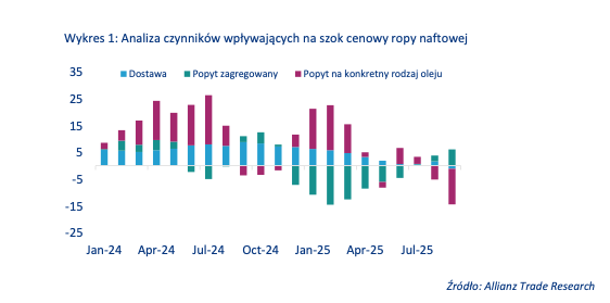 Ceny ropy pozostają pod silną presją nadwyżki podaży, a (słaby) popyt również nadal wpływa na nie negatywnie. Ceny ropy wykazywały tendencję spadkową przez cały 2025 r., pod presją napięć handlowych i nadwyżki ropy, pomimo sporadycznych geopolitycznych skoków cen. Cena ropy Brent spadła o około 14% w pierwszych dziewięciu miesiącach 2025 r. w związku z dużą podażą i słabym popytem. Pod koniec października cena ropy Brent spadła na krótko do poziomu blisko 60 USD za baryłkę w związku z rosnącymi obawami o nadwyżkę podaży.