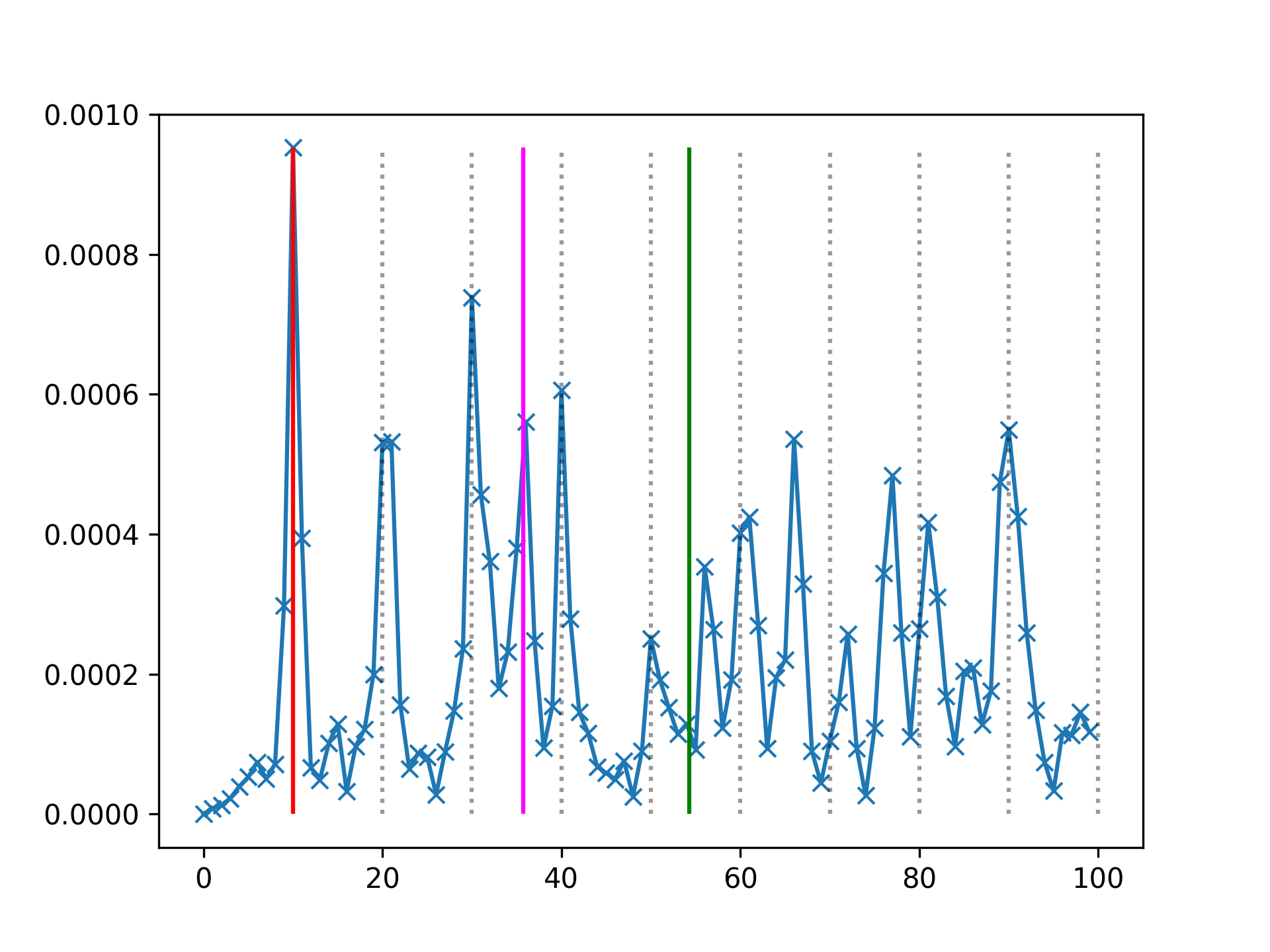 Do powyższego opracowania została przyjęta metoda oceny stanu łożyska na podstawie analizy widma częstotliwości drgań (przyspieszenia) z wykorzystaniem transformaty Fouriera FFT. Obrabiany sygnał o długości 10 sekund zawierający 2’000’000 odczytów, który został podzielony na 20 równych półsekundowych części. Dla każdej z takich części została wyznaczona osobna transformata Foureira (Rys.3). Tak przygotowane dane zostały następnie poddane procesowi normalizacji częstotliwości.