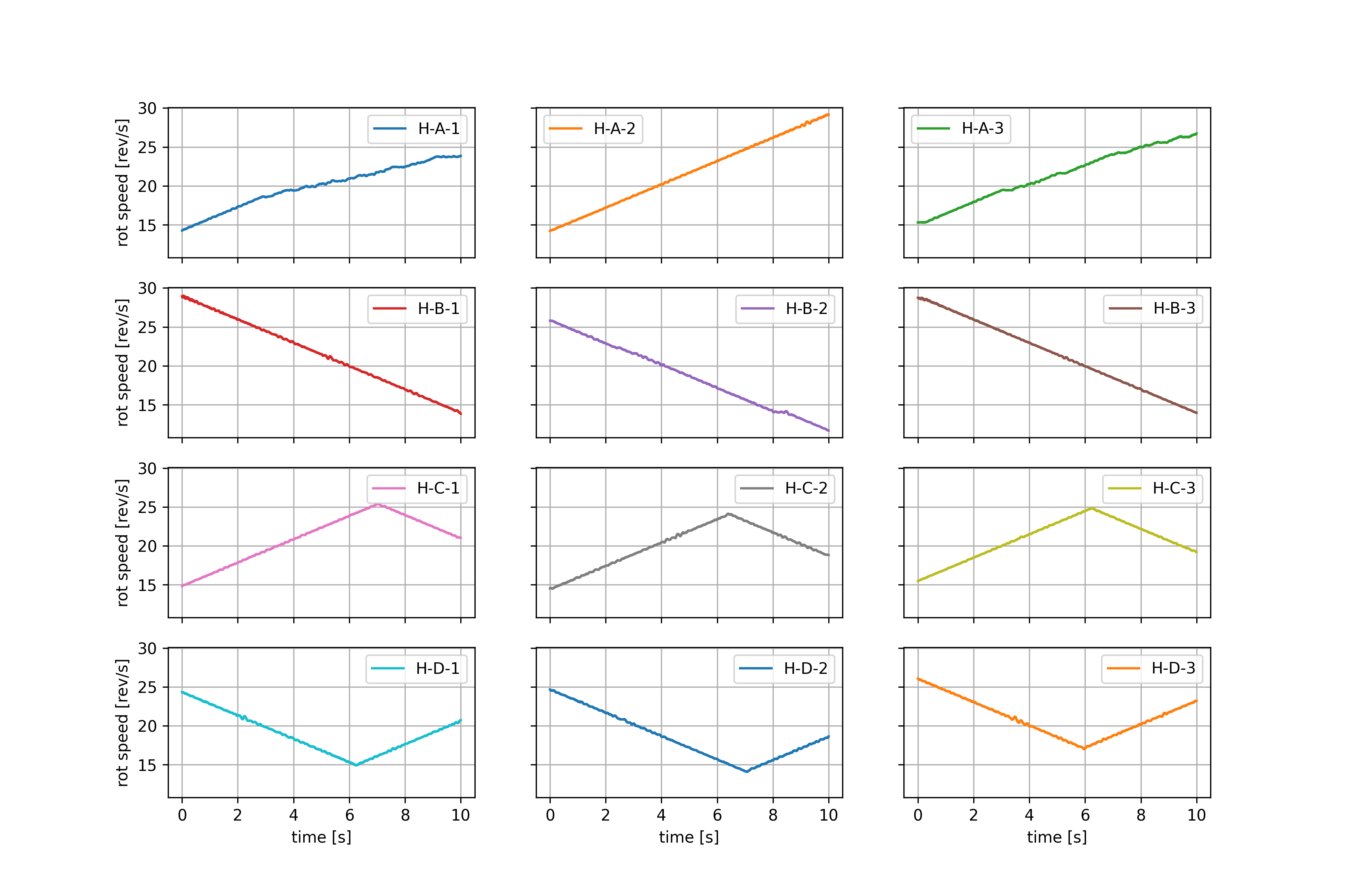 Z nieprzebranej zawartości zasobów internetu można ściągnąć nagrania jednego typu łożyska ER16K. Dane zostały opracowane na Kanadyjskim uniwersytecie w Ottawie przez Huan Huang, Natalie Baddour i opublikowane na łamach ELSEVIER jako artykuł “Bearing vibration data collected under time-varying rotational speed conditions” w 2018r. Zawierają one odczyty pracującego łożyska zarówno dla stanu nieuszkodzonego jak i poszczególnych typów uszkodzeń. Zarejestrowane informacje to: zmienna prędkość obrotowa łożyska i odczyty mierzonych wibracji w postaci przyspieszeń. Częstotliwość próbkowania wynosiła 200 kHz. Każdy stan łożyska został zarejestrowany dla kolejno: jednostajnie wzrastającej i malejącej prędkości jak i również dla wzrastającej a następnie malejącej i odwrotnie, po 3 różne próbki dla każdego schematu prędkości (Rys. 2).