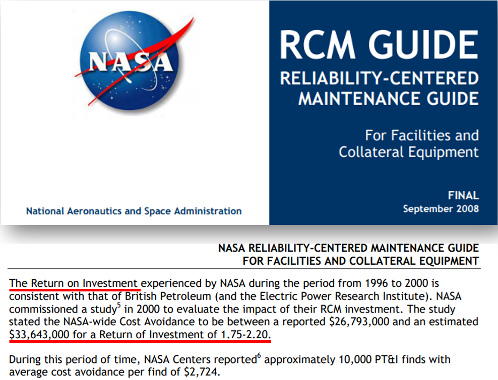 - NASA podaje, że ten zwrot z inwestycji (ROI) jest spójny z tym, jaki odnotowały podobne wdrożenia RCM przez British Petroleum i Electric Power Research Institute (EPRI).