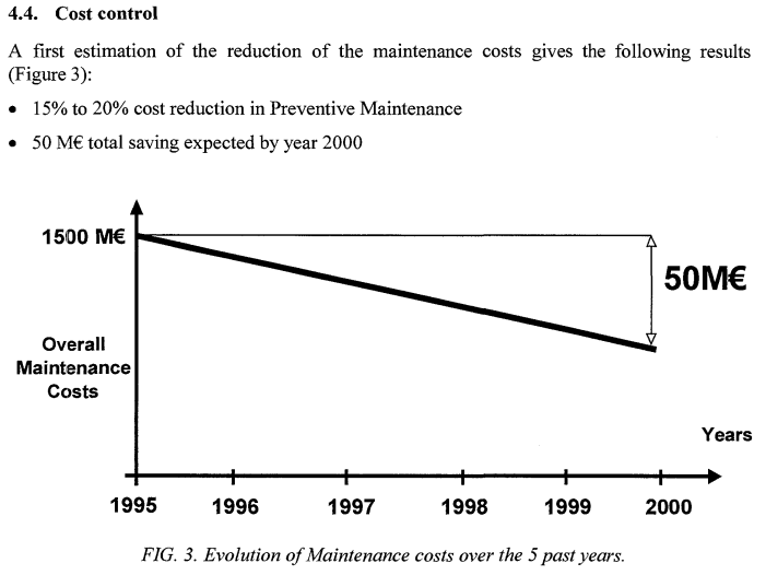 - Kontrola kosztów – oszczędności na poziomie 15-20% w konserwacji zapobiegawczej, co do 2000 (od 1991) roku miało przynieść oszczędność około 50 mln euro.