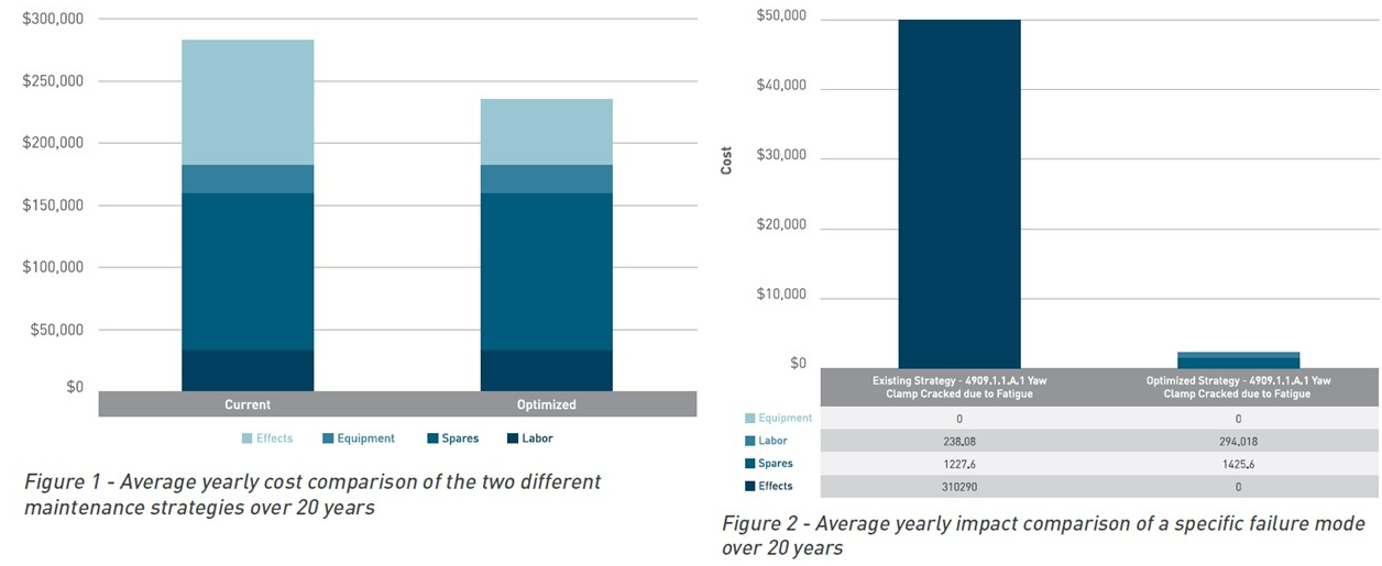 Wynik raportu RCM dla firmy energetycznej. Pierwsza kolumna [Figure 2] pokazuje, ile będzie kosztować ich obecna strategia w skali roku; podczas gdy druga pokazuje zoptymalizowany model. Ten ostatni zapewnia 46 000 USD oszczędności na turbinę rocznie, czyli blisko 130 mln USD w ciągu 20 lat w całej flocie.