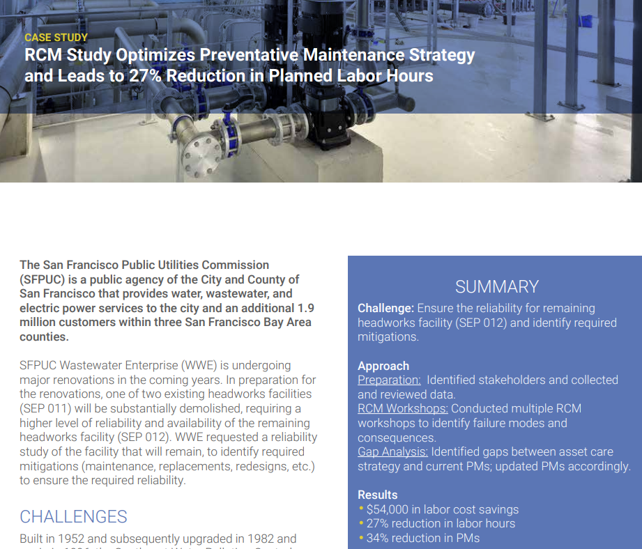 Wdrożenie RCM w SFPUC Wastewater Enterprise (San Francisco, USA) miało na celu poprawę niezawodności obiektu SEP 012, który musiał działać jako jedyny headworks facility od 2019 do 2024 roku. Analiza obejmowała 349 aktywów i miała na celu optymalizację strategii prewencyjnej konserwacji (PM).